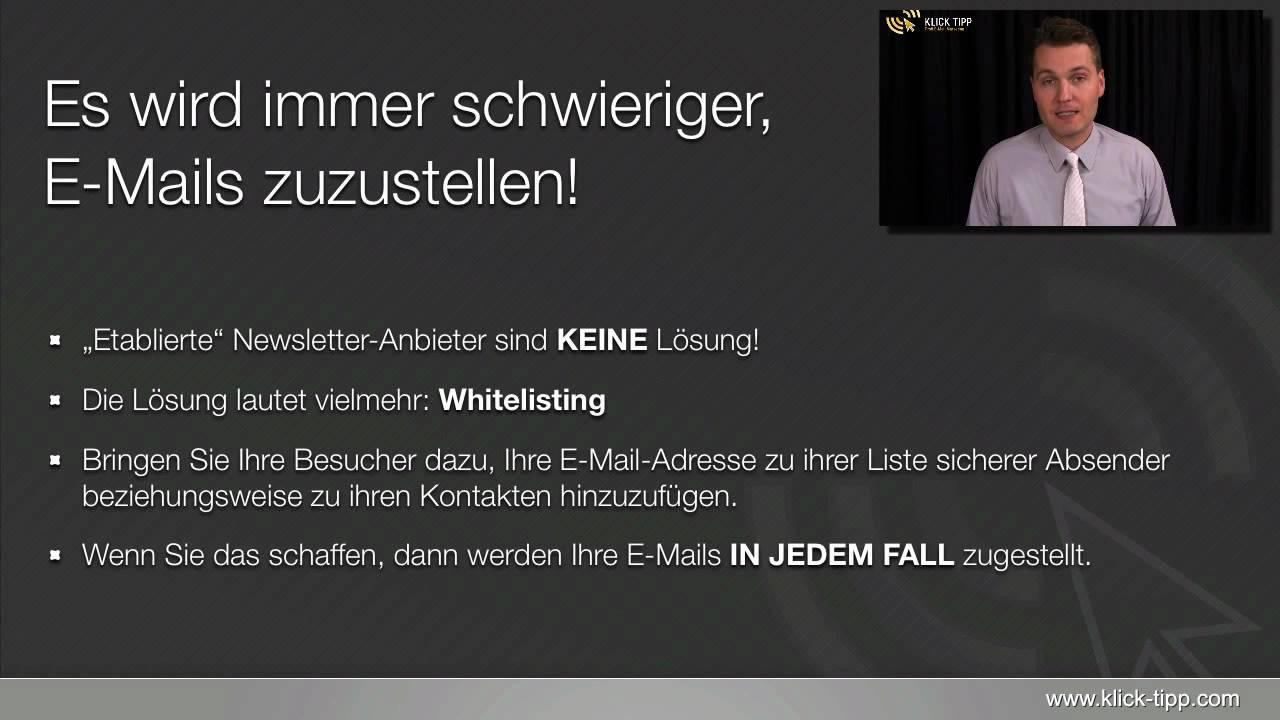Das weltweite Spam-Volumen nimmt beständig zu. Es hat mittlerweile bedrohliche Ausmaße erreicht. Cisco schätzt, dass mehr als 90 Prozent der global versendeten E-Mails als Spam klassifiziert werden können. (Quelle: Cisco Annual Security Report.) Aus diesem Grund werden die Spam-Filter der großen Internet-Service-Provider wie AOL, GMail, GMX, Hotmail oder web.de immer dichter gewebt. Immer weniger E-Mails gelangen in die Posteingangsfächer der Adressaten. Für Sie als Unternehmer heißt das, dass es leider immer schwieriger wird, mit Ihren Interessenten und Kunden effektiv über E-Mail zu kommunizieren. Die einzige Technik, mit der Sie sicherstellen können, dass Ihre E-Mails tatsächlich in den Posteingangsfächern Ihrer Leser ankommen, ist das sogenannte User-Whitelisting. Veranlassen Sie Ihre Adressaten dazu, Ihre E-Mail-Adresse, über die Sie Ihre E-Mails an sie senden, in ihr Online-Adressbuch beziehungsweise in die Liste der erwünschten Absender („Whitelist“) aufzunehmen. Auf diese Weise werden Ihre E-Mails in jedem Fall zugestellt, und zwar unabhängig von ihrem Inhalt. In dem folgenden Lehrvideo zeigt Ihnen Mario Wolosz (der Gründer von Klick-Tipp), wie wirkungsvoll das Instrument des User-Whitelistings ist. Er stellt Ihnen den Fall eines Unternehmers vor, der seine Click-through-Rate (das ist die Zahl der Klicks auf die Links in Ihrer versendeten E-Mail im Verhältnis zur Zahl der versendeten E-Mails) um sage und schreibe 58 Prozent steigern konnte. Eine solche Quote bedeutet, dass bei gegebener Kaufrate auch die Online-Umsätze um mehr als die Hälfte zulegen! Wenn Sie erfahren wollen, wie Sie das Ergebnis Ihrer Website mit User-Whitelisting auf einfache Weise verbessern können, dann klicken Sie auf den Play-Button in dem folgenden Video: